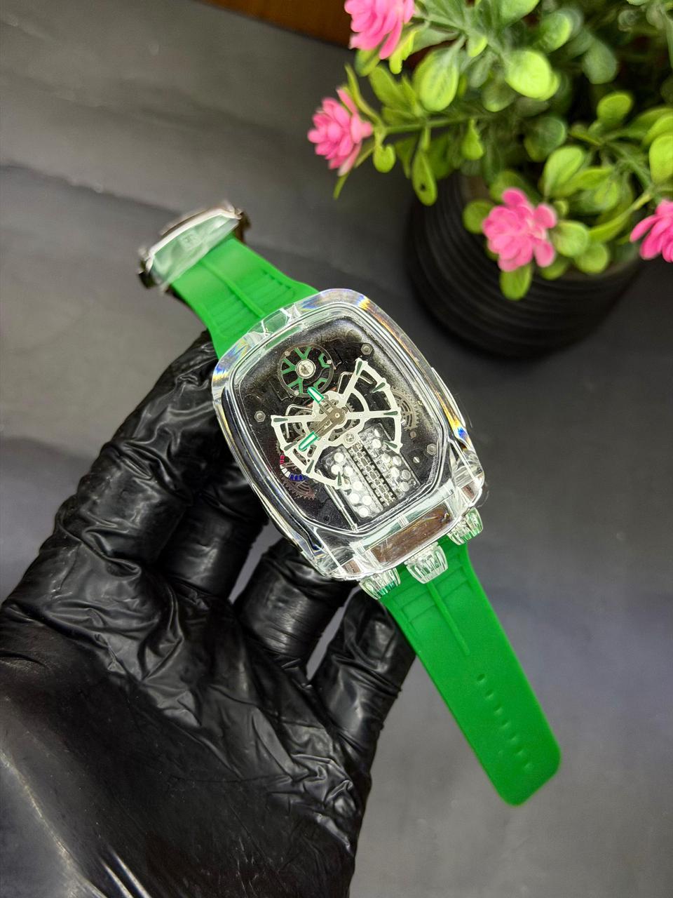 Experience the bold, high-performance aesthetic inspired by the iconic Jacob & Co. Bugatti Chiron Tourbillon Green Sapphire. This striking timepiece features a transparent case design that reveals a skeleton-style dial, capturing the spirit of luxury engineering and innovation. Paired with a vibrant green silicone strap, it delivers a sporty yet futuristic look perfect for standout styling.