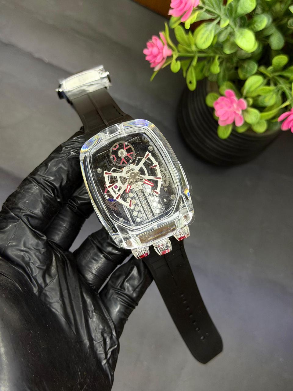 Embrace a sleek and powerful aesthetic with this timepiece inspired by the legendary Jacob & Co. Bugatti Chiron Tourbillon Black Sapphire. Designed with a bold black transparent case, this watch delivers a stealthy yet futuristic look, perfectly reflecting the spirit of high-performance automotive engineering.