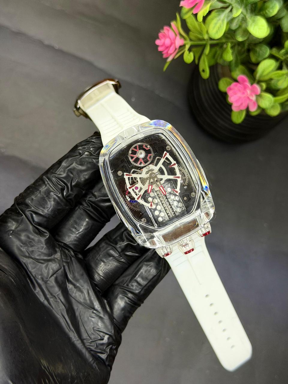 The skeleton dial reveals intricate inner detailing, including an engine-inspired design that reflects the precision and innovation of high-performance automotive engineering. Its crisp white finish adds a unique, standout appeal—perfect for those who want a stylish and sophisticated statement accessory.