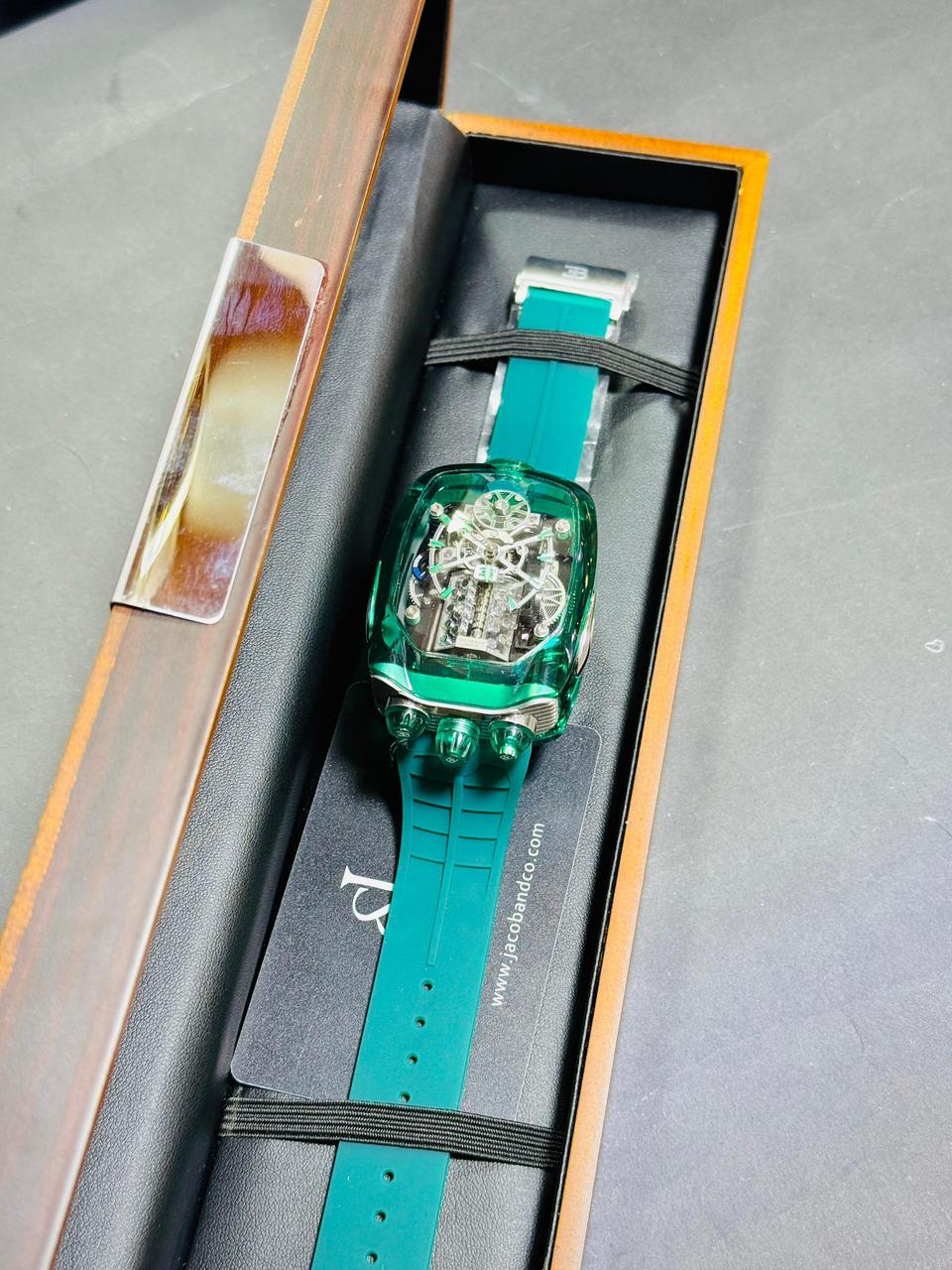 The watch in the image is a Jacob & Co. Bugatti Chiron Tourbillon, specifically the green sapphire crystal version. A “first copy” (replica) of this watch typically aims to mimic the original’s appearance and features.