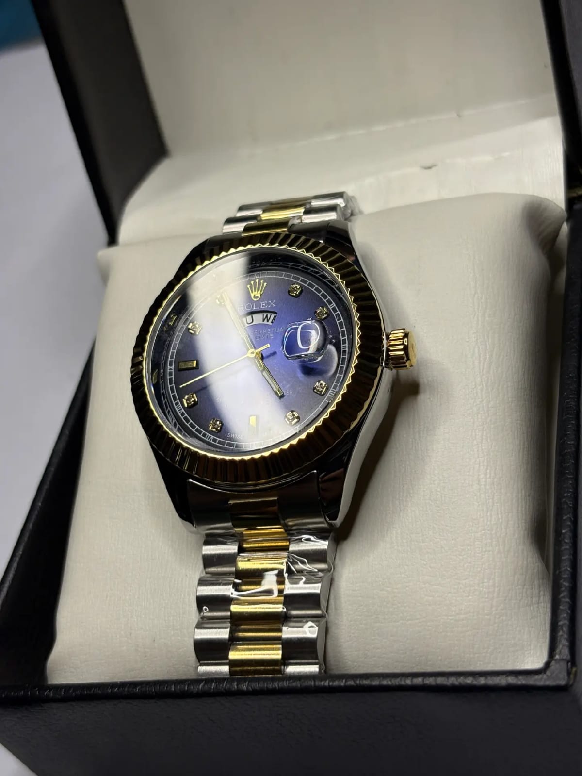 The ‘Bluesy’ Submariner, a Rolesor classic combining Oystersteel and 18ct yellow gold. Features a striking blue ceramic bezel and sunburst blue dial. A versatile timepiece for luxury, performance, and 300m water resistance.